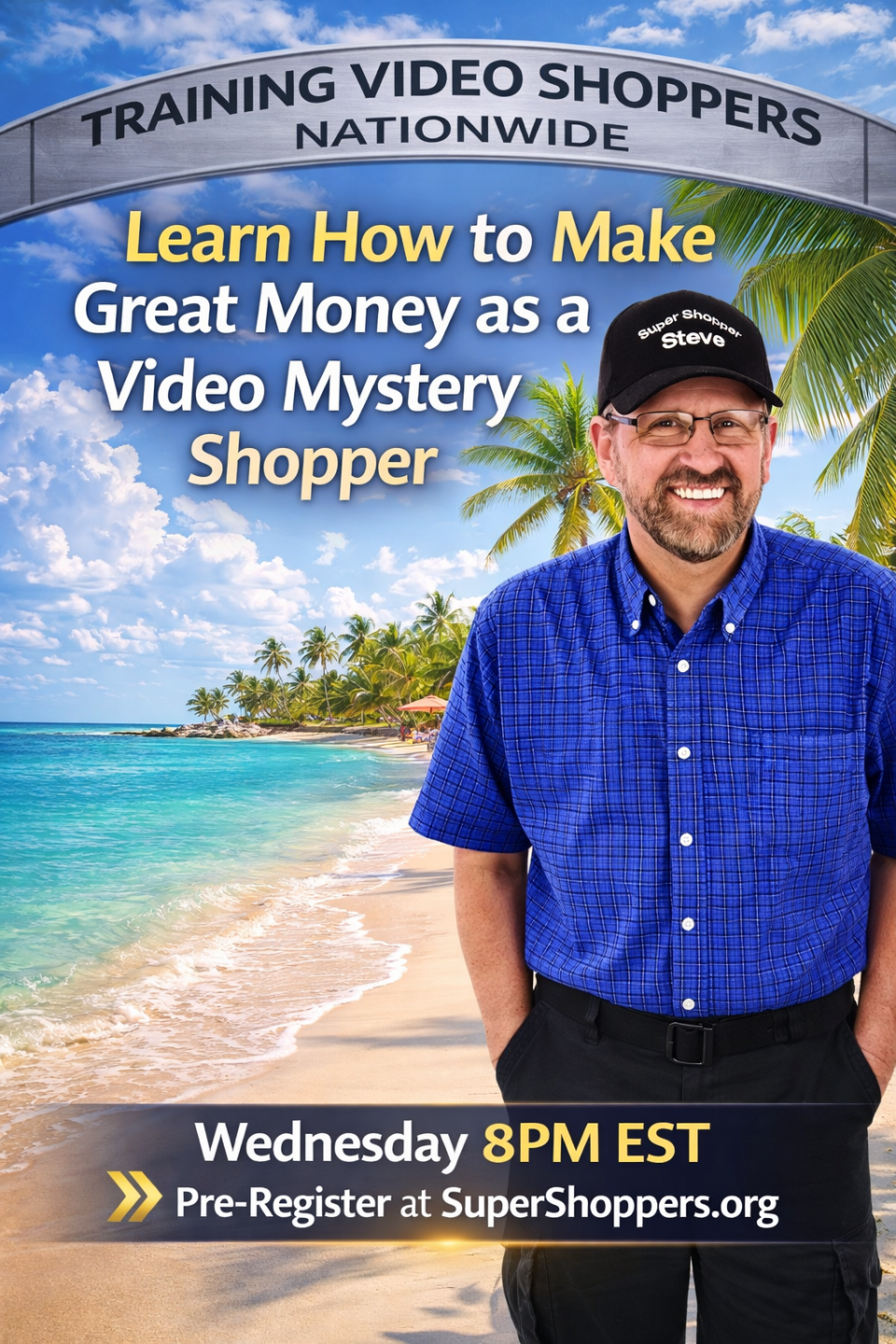 SuperShopperSteve's FREE LiveWebinar will teach you everything you need to know about Video Mystery Shopping! The Webinar is LIVE and you can ask questions in the chat as he shares how he has completed over 20,000 Mystery Shops in his career!Â
